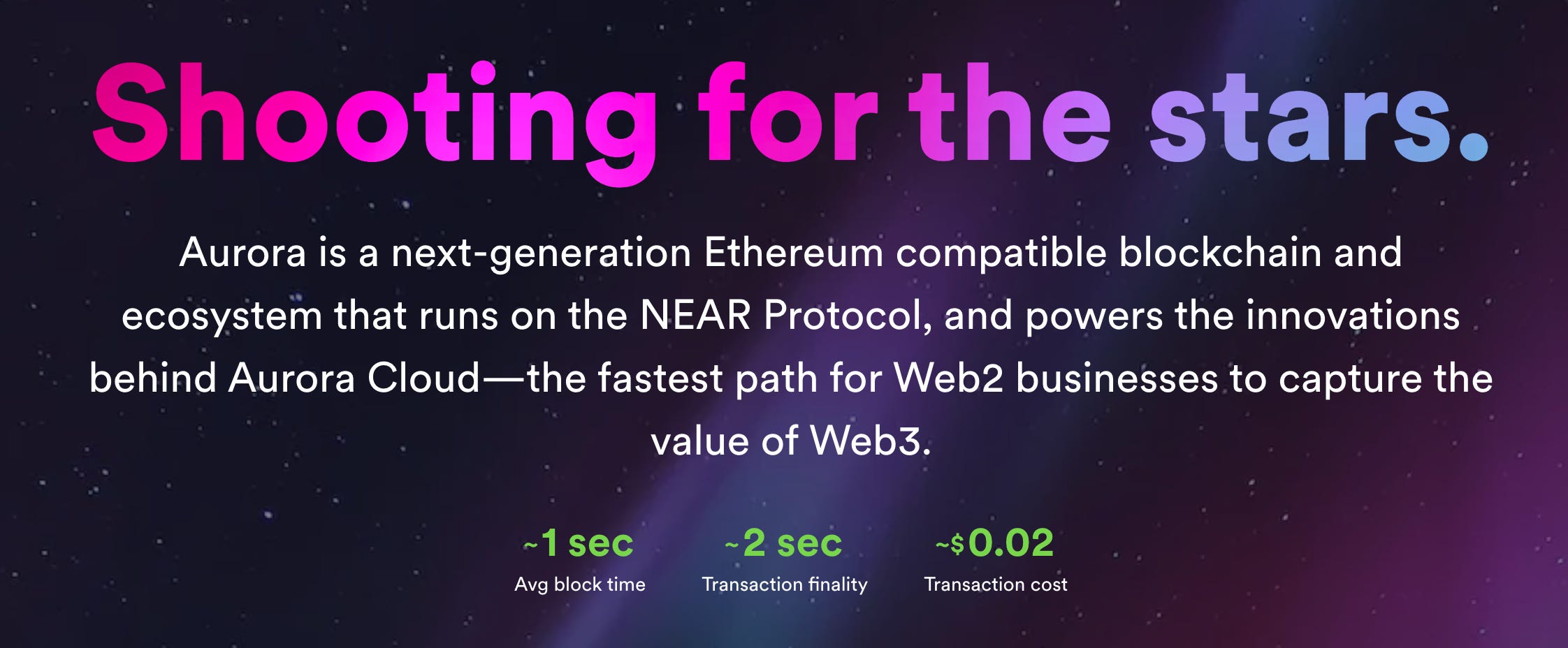 Aurora is an Ethereum compatible blockchain and ecosystem that runs on the NEAR Protocol; a layer-1 blockchain which is fast (2-3 second transaction finalization), scalable, and carbon neutral. Aurora was launched on May 12, 2021.
